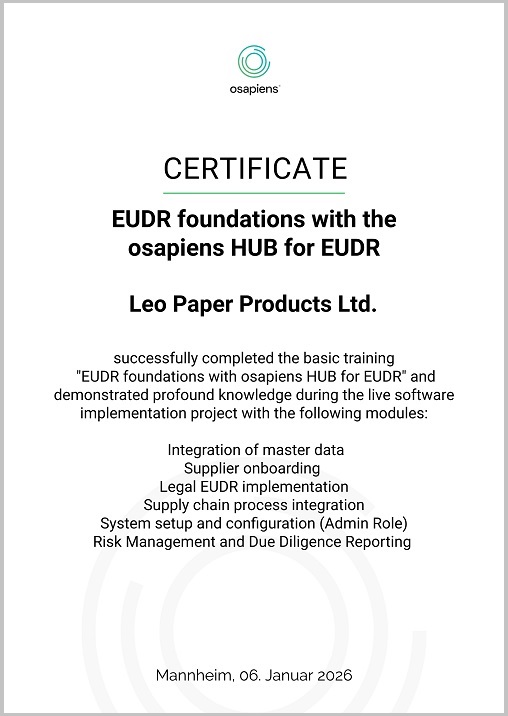 Leveraging this certified framework, we are positioned to efficiently assist clients with their EUDR readiness—from practical documentation gathering to process design. The integrated osapiens platform facilitates automated risk assessment and streamlined due diligence and help to simplify compliance and enhance supply chain visibility.